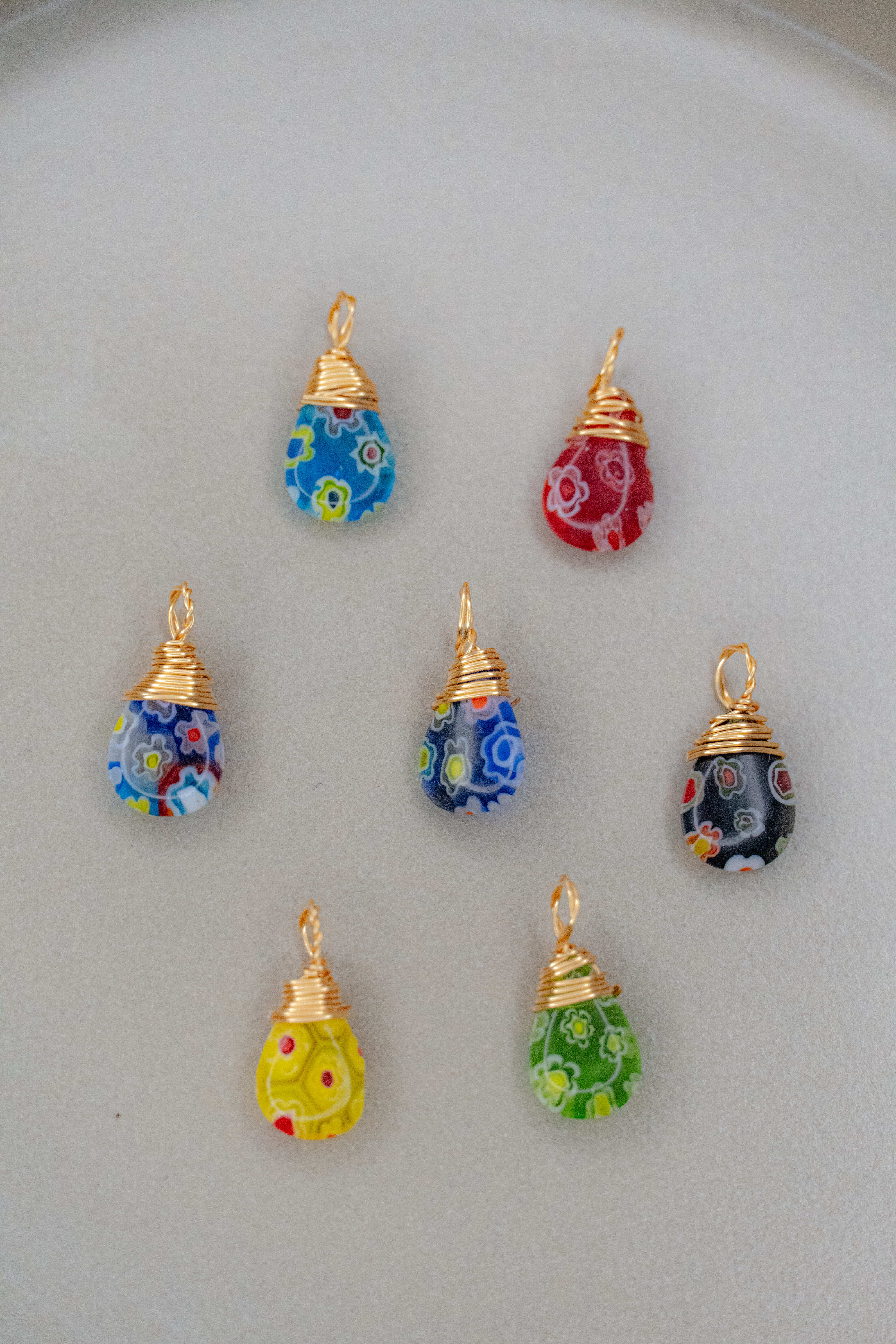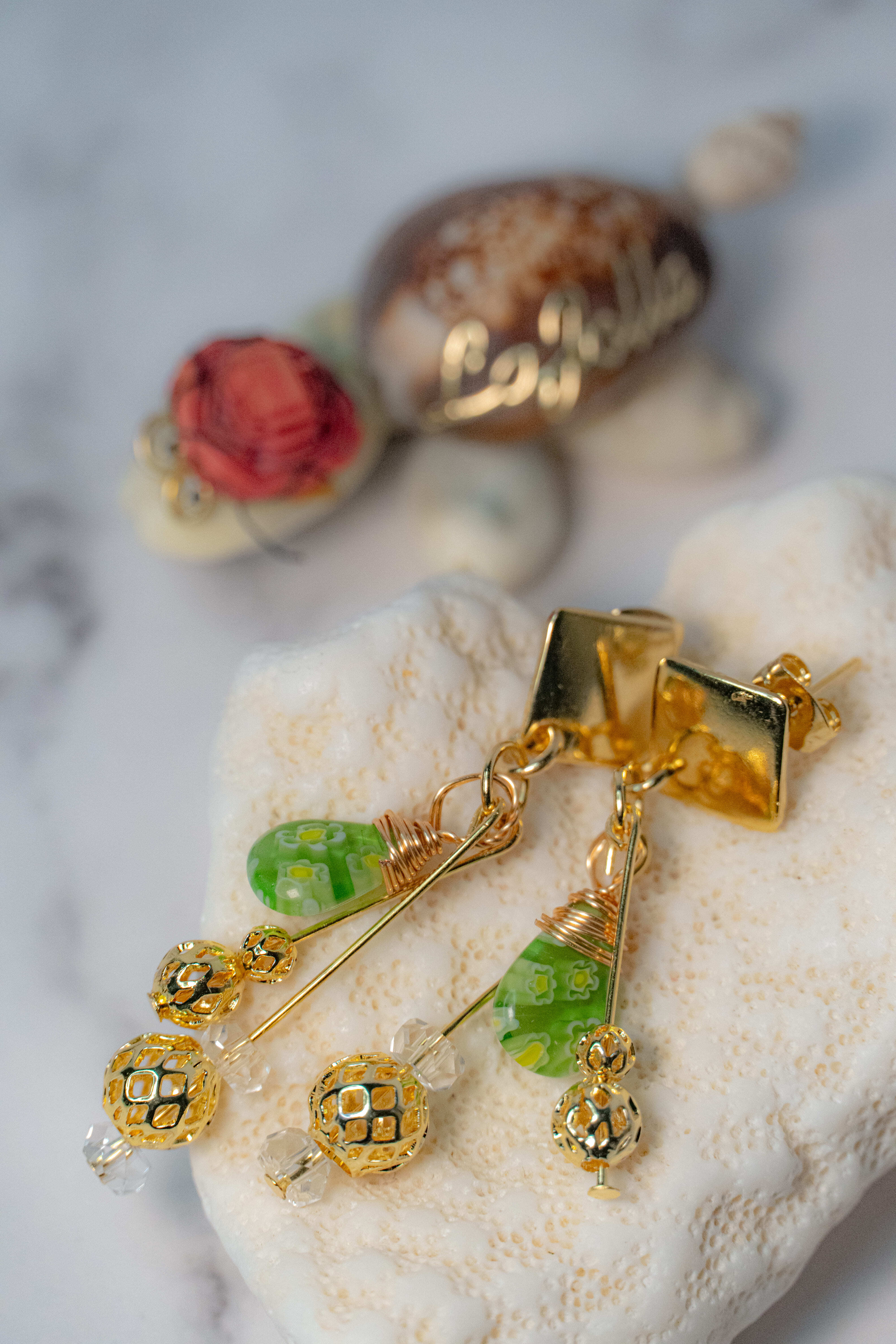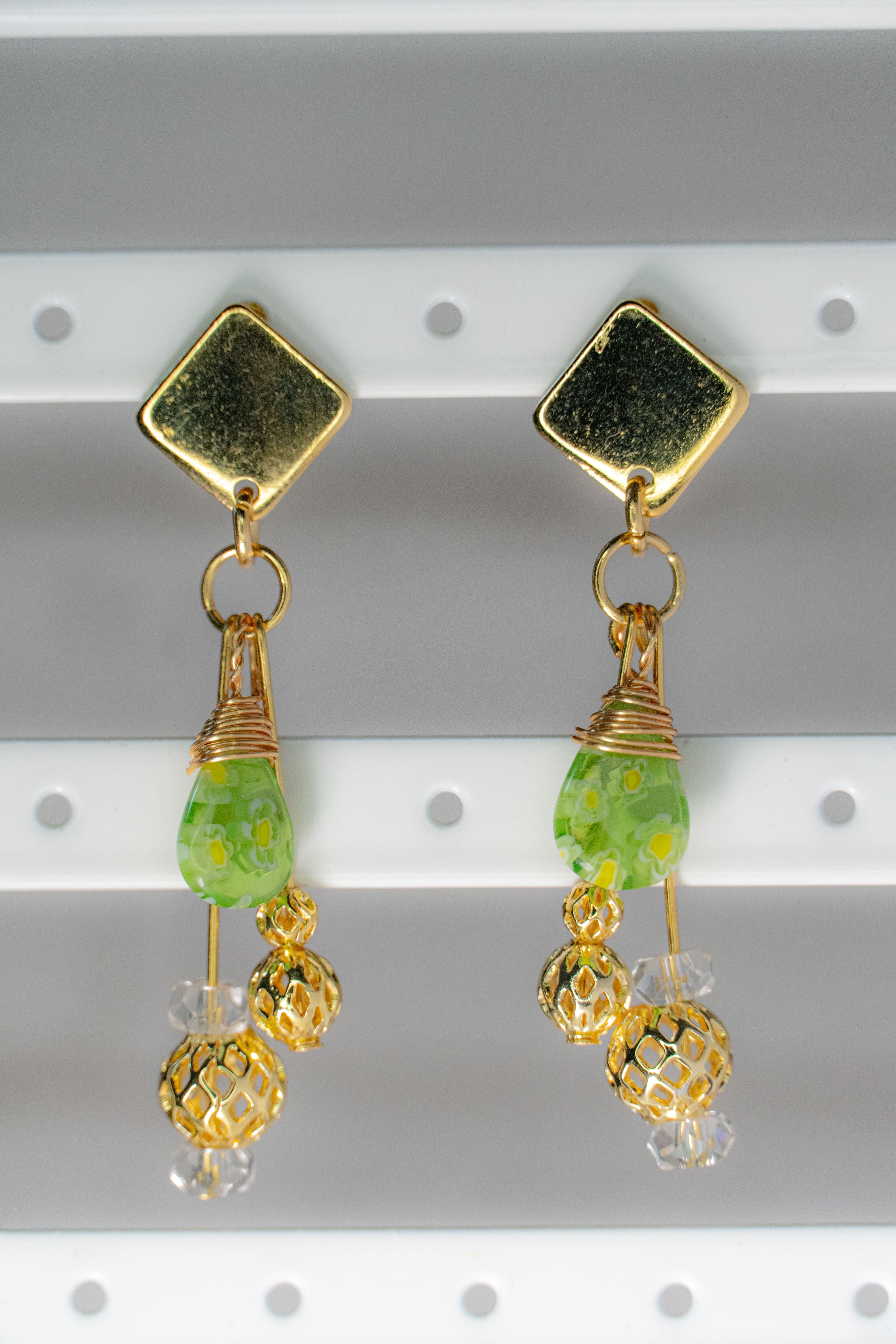 レトロな花柄が散りばめられた雫型のガラスパーツをを使用した